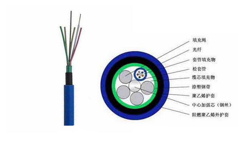 層絞式: 由內到外依次為中心加強件(一般用磷化鋼絲),光纖,光纖膏,松套管,扎帶,纜膏,鋼帶,PE內護層,阻燃護套(藍色)